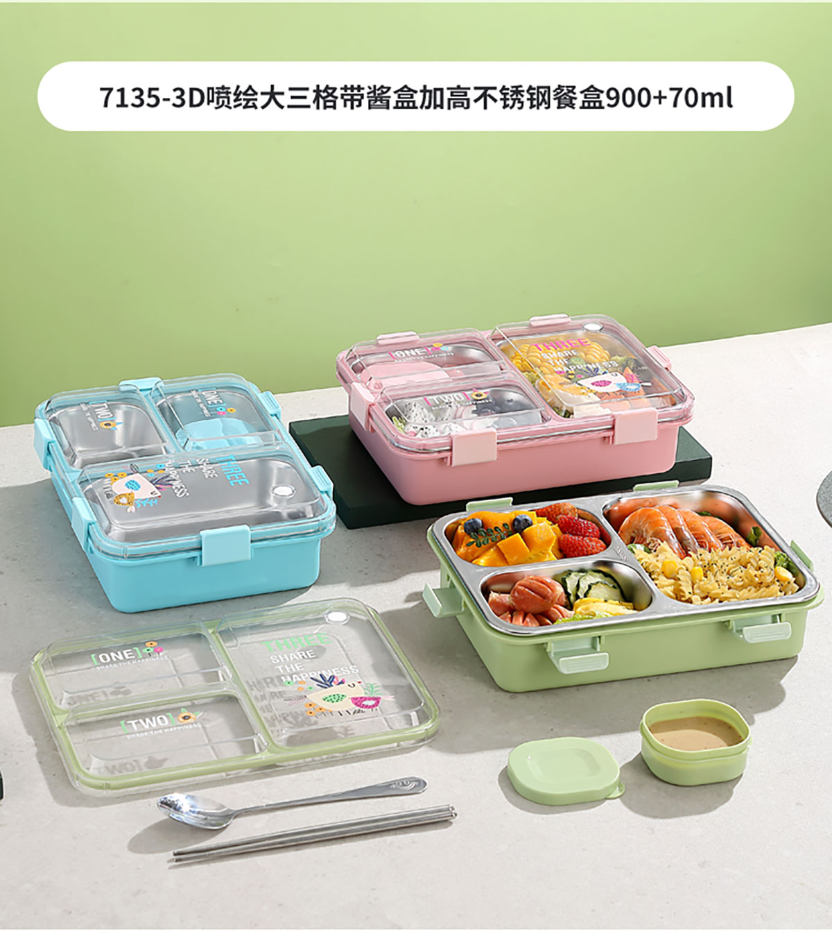3D噴繪大三格/四格帶醬盒/四格帶碗加高不銹鋼餐盒